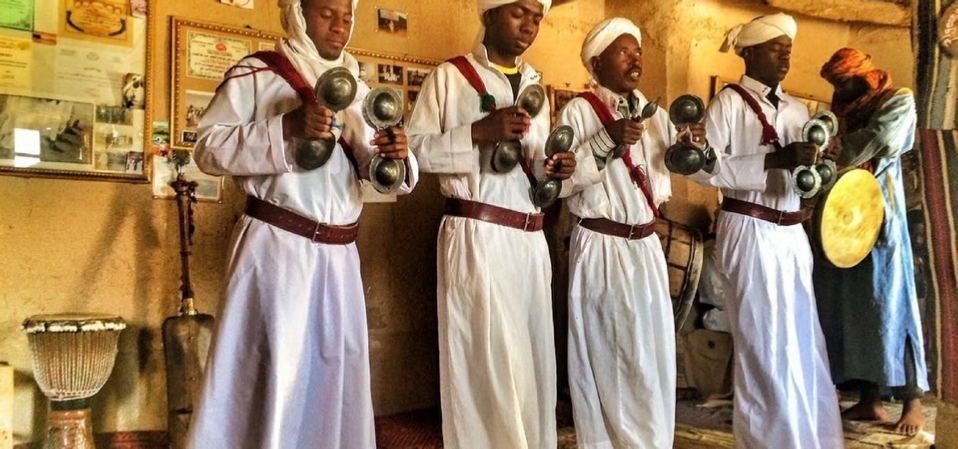 Enjoy listening music in village of Khamlia. Gnawa music is very popular and traditional culture in Morocco.
