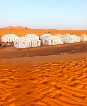 (Visit Unesco site of Ait Benhaddou, Ouarzazatte movie studios, explore Dades valley, Valley of Roses, Erfud, Rissani and Merzouga desert camel ride, night in desert camp.)