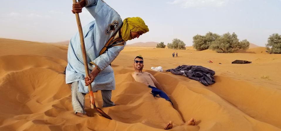 The Merzouga desert therapy called “sand bath in Merzouga” is an ancient Berber treatment. It is very helpful for curing ailments affecting the joints and also muscles. Merzouga sand bath therapy is best performed during the summer months of July and August. For the preparation of the Merzouga desert sand bath therapy, we dig a hole in the sand in the size of the specific person taking the bath and about 20 cm deep in sand. The hole is left open for about 30 minutes to allow the heat to penetrate into the sand.